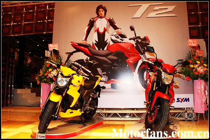 近期于网路上讨论沸度直爆点的SYM T2,终于选择在2011年7月15日所举办的三阳工业全球经销商大会中正式发表,此全新4V水冷250c.c.动力规格之街跑车全新格局,且在T2发表之际,SYM也同场发表2011年全新升级的iRX115,加上全球战略车Maxsym 400i,三强鼎立的发表,让此场经销商大会显得异常热闹。