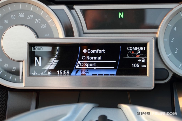 如果说动力单元和电子单元已经这么恐怖了,那么再加上电控可调避震单元这台机车已经可以称做怪兽了。因为它是全世界第一款带有电子悬挂调节的摩托车。减震的硬度分为“运动、舒适、正常”三个档,运动模式时减震偏硬使前后轮更加灵活,可控性强。舒适模式下则减震偏软,为驾驶者提供最大化的舒适度,并且还能保持出色的稳定性,而正常挡则是中和的两者的优点。除了三种减震模式以外,K1600GTL还拥有三种驾驶模式(动力输出模式),雨天、公路和动态,驾驶者可以按下右手开关总成的按钮选择适合的驾驶状态。