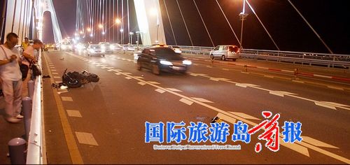 事发当晚途经世纪大桥的几位小轿车司机透露,事发前,看到两辆摩托车车速很快地从世纪大桥上呼啸而过,在接近桥顶处,其中一辆摩托车先是撞上同侧车道的电动车,接着刮碰到一辆小轿车后摔倒,摩托车司机当场躺在地上不动。另一辆摩托“赛车”见发生事故则迅速驶向海甸岛。