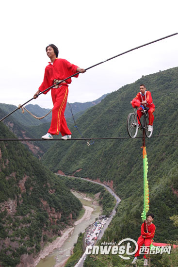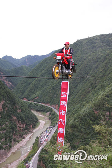 摩托车、自行车走钢丝横越嘉陵江是凤县旅游节系列活动之一,近万名游客和骑行爱好者聚集凤县灵官峡景区,观看穿越活动。来自宝鸡市汽车摩托车运动协会的罗周强和河南黄河特技队的三名队员用骑摩托、骑自行车和徒步的方式,通过一根悬在钢丝横空穿越了险峻灵官峡和滔滔嘉陵江。