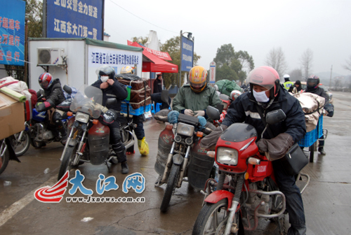 大江网讯 颜喜胜、记者时雨摄影报道:往年,不少在外打工的农民工骑着摩托车返乡,随着今年春节的临近,摩托车返乡大军又浩浩荡荡地回来了!1月1日,记者从玉山县交警部门获悉,每天有2000多辆摩托车经过交警部门设立的服务站。
