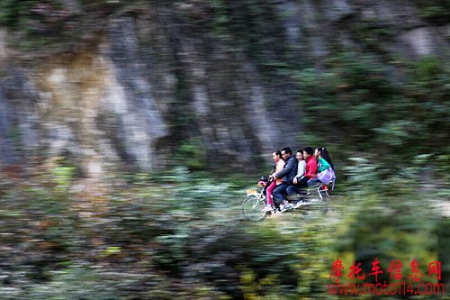 10月中旬的一天,在陕西省略阳县境内泉溪沟至该县县城路段,一名男子用一辆双轮摩托车载着四名小学生飞奔在崎岖的沿河山路上。由于交通不便,陕西山区的一些学童只能搭载非客运车辆前往学校。
